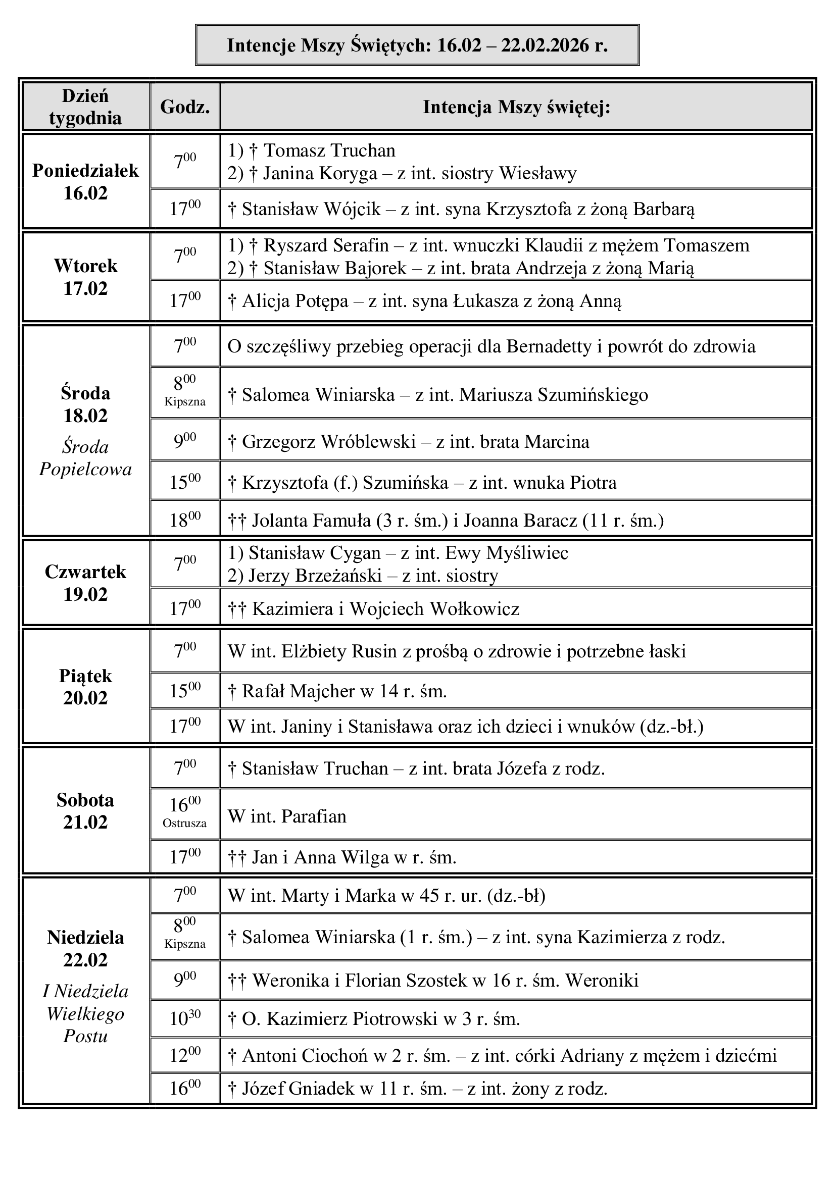 Kościół parafialny: 7.00, 9.00, 10.30, 12.00, 16.00 Kościół filialny w Kipsznej: niedziela 8.00 Kaplica w Ostruszy: sobota 16.00 (od 1 października) 17.00 (czas letni)